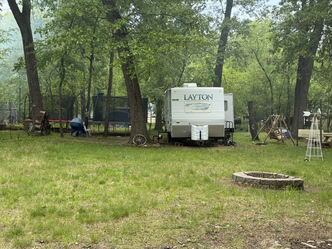 Located just a short walk from the Beach, Pool 2, and beautiful Woodhaven Lake, this property is ready for you to enjoy! Pull into the gravel driveway, property features a well-maintained 2007 Layton Homes Travel Trailer offering 2 bedrooms-one at the front and a bunk room at the rear-plus additional sleeping space with the sleeper sofa and convertible dinette. The kitchen offers plenty of storage. Electric has been upgraded - for potential upgrade to a park model in the future. Step outside to enjoy a level lot with landscaping and completed with a trampoline, fire pit, and shed. Common ground directly behind for added privacy and nature views. Best of all, everything stays-furniture, appliances, and outdoor features (excluding personal items), making this an effortless move-in-ready property. Don't miss this perfect spot! Call today for a showing! Please note that Woodhaven Lakes is a gated recreational community and cannot be used as a primary residence or homestead. You must be accompanied by a broker to view any properties, YOU CANNOT ACCESS THE CAMPGROUND WITHOUT A PASS. The property owner pays the association fees.